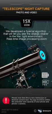 This app allows to make a super zoom. This is a great way to observe the stars. With the easy-to-use and beautiful design of the app, you will feel like a professional. The screen shows time and different indicators. You can take a screenshot in real-time. It is a perfect handy zoom. You don’t need to carry a heavy telescope. All you need is your smartphone. - Zoom in and zoom out. - Adjust the brightness to see the stars better.